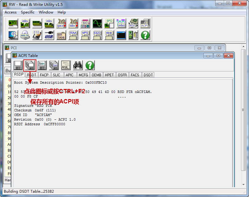 2、用待改BIOS的电脑启动RW Everything(v1.2以上),菜单选“Access”-->“ACPI Tables”,ACPI Table窗口出现后,按Ctrl+F2保存RW报告。