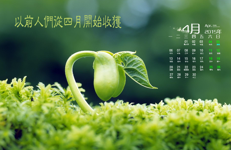 “以前人们从四月开始收获……”突然就想起这么个旋律了,是的,不知不觉就已经到2015年四月一号了——以上是题外话,本节内容小编为大家精选带来的是一份psd格式高清免费版2015年4月桌面日历壁纸,当然你也可以将它作为2015年四月桌面日历素材使用,四月开始,加油吧!如果你觉得今天是4月1号愚人节你有可能被小编捉弄一番,那么在下载本文档之前记得三思哦!——嘿嘿!开个玩笑,欢迎有需要的朋友点击本文下方相应的下载地址下载使用该2015年四月桌面日历素材,四月,你好!四月,加油!