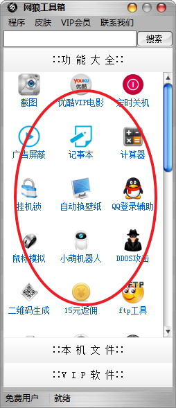 网狼工具箱内置了大量电脑常用软件,我相信,你用它就会立马爱上它。没有比这款工具箱来得更实在的了,40+款实用小工具,打开即可使用,包含优酷VIP电影、广告屏蔽、截图工具、二维码生成等,欢迎下载!