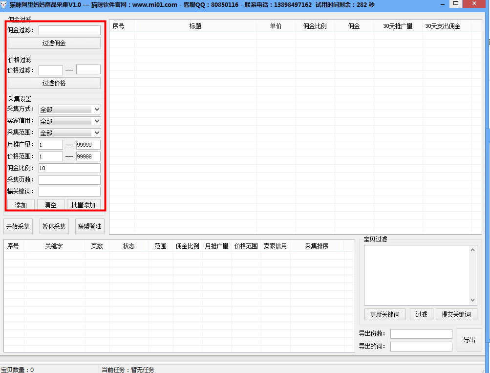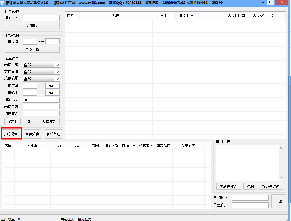 猫咪阿里妈妈商品采集软件,采集阿里妈妈上面的天猫淘宝商品,能够选择价格范围,佣金范围,指定天猫淘宝或者全部采集,过滤违规关键词等更多功能请到软件上面测试