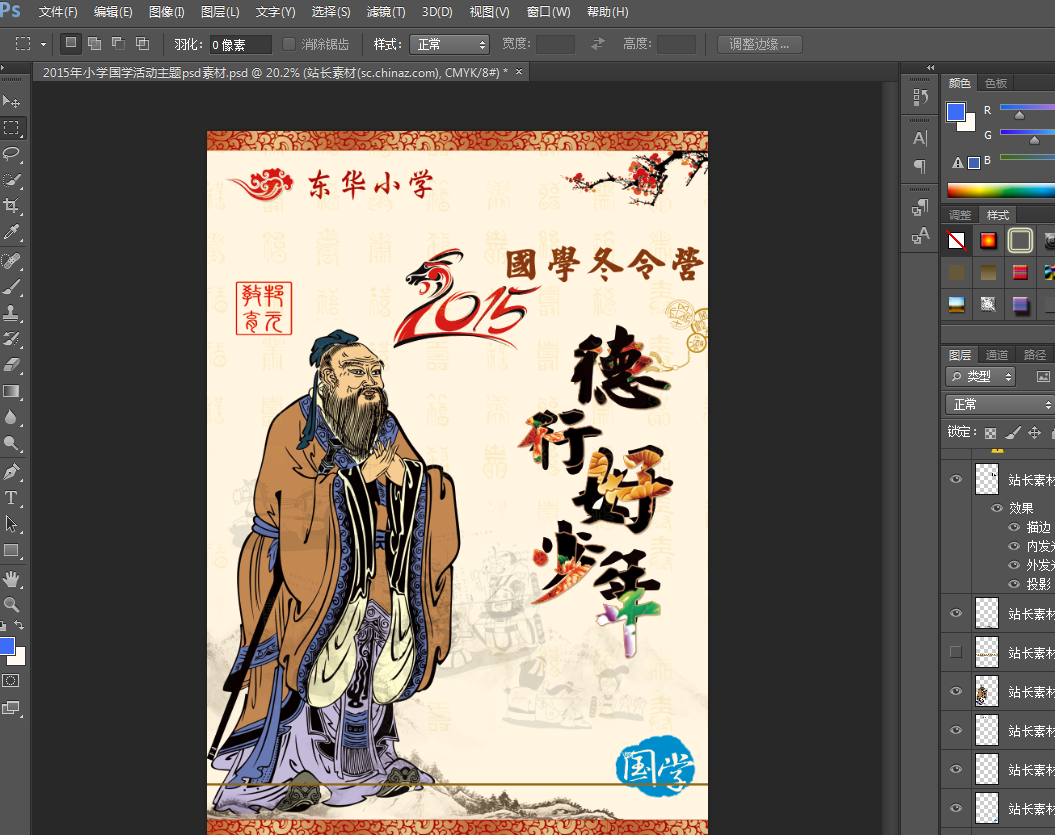 现如今的教育更加注重中国传统文化,比如国学,从小就让孩子们学习国学知识,能促进他们的德智全面发展。有的小学还会举行国学冬令营活动,那选用什么样的冬令营海报设计素材比较好呢?下面小编就给大家介绍一个国学宣传海报,具体是2015年小学国学活动主题psd素材,是不是非常大气简约时尚呢?如果有朋友需要这样的国学图片素材,那就赶紧免费下傲视使用啦。