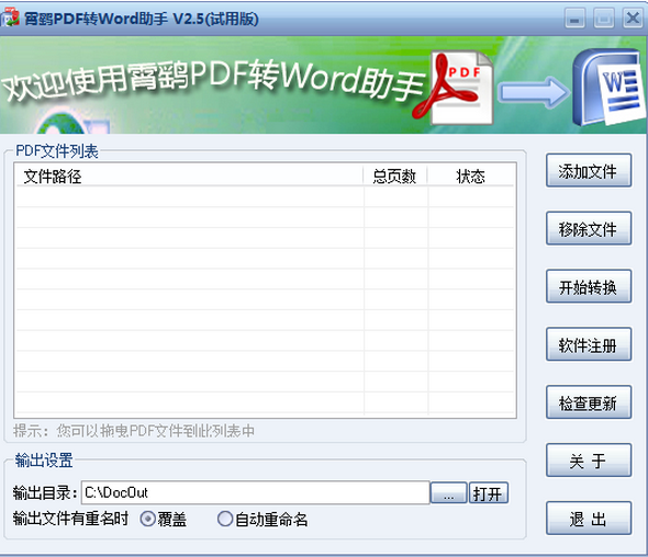 软件支持文件或文件夹拖曳操作,可直接将需要转换的PDF文件(或包含PDF文件的文件夹)拖曳至PDF文件列表框中,