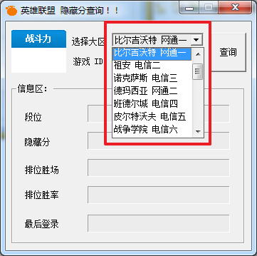 1、打开英雄联盟隐藏分查询器,选择玩家所在大区