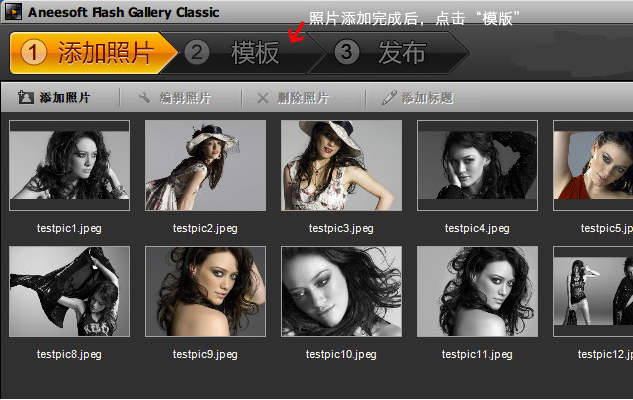 1、添加照片:把需要制作成相册的照片添加进来,并根据自己需要调整顺序,然后点击 “模版”
