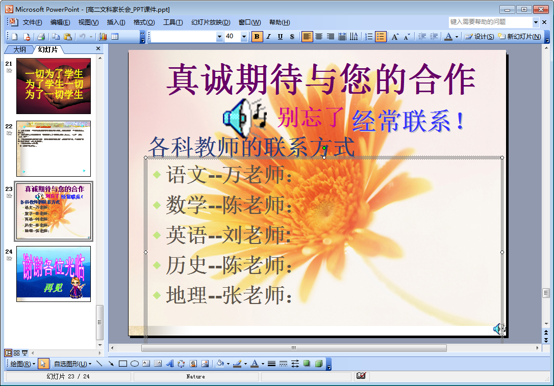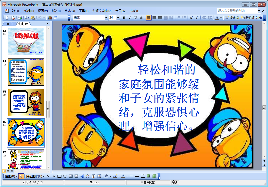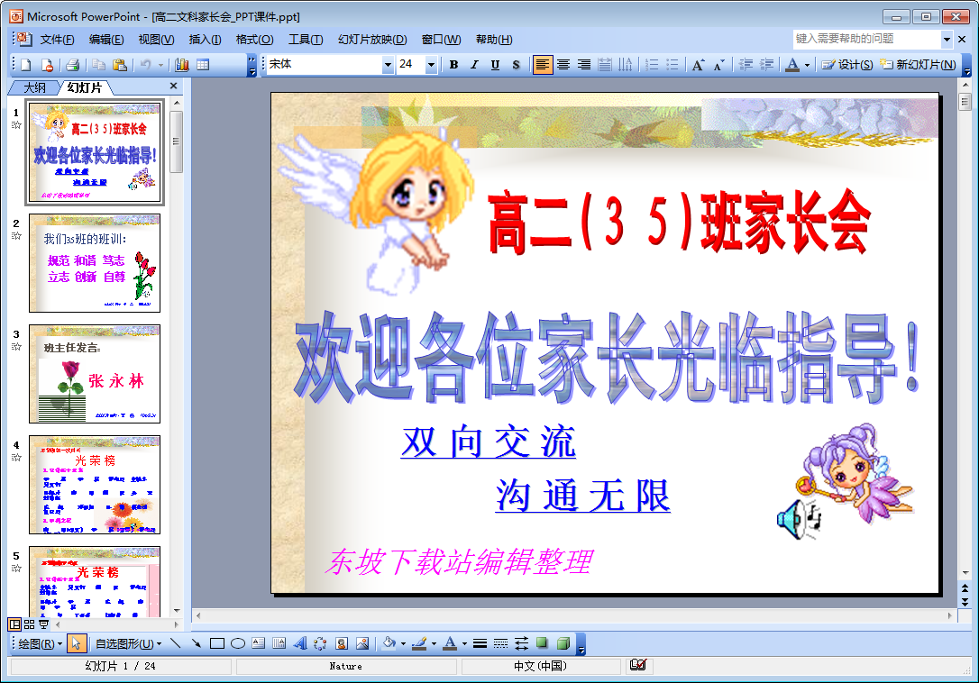 “欢迎各位家长光临指导”、“规范、和谐、笃志、立志、创新、自尊”——这是某高二文科班的班训——合起来介绍的话,以上文字是这份高二文科家长会PPT课件的相关内容。这是一份由24页组成的高二家长会ppt课件,该家长会ppt课件为完全免费版,有需要的朋友只需点击本文下方相应的下载地址进行下载即可将这份高二文科家长会PPT课件下载下来进行编辑使用,欢迎有需要的朋友进行下载使用!