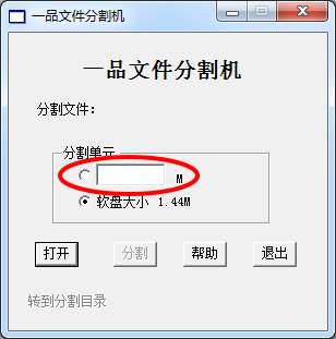 1、运行一品文件分割机,出现主界面后,首先选定分割单元的尺寸大小,预定值为分割为软盘大小,也可自行定义大小,并在输入框中输入数值。
