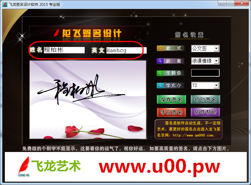 输入姓名自动生成手工效果签名。可以一次性生成4款签名,包括公文签、公文签反签、英文签1、英文签2。以往的签名软件生成的名字是单独的字,龙飞签名软件生成的是互连的字。软件生成的中文和英文字都是由签名设计师陈继世手工书写后编辑整理形成的软件,软件所生成的全部签名为龙飞签名设计独立完成,无其它电脑字库字。提供复姓设计。软件可以实现反色效果,签名保存为图片后可以打印。