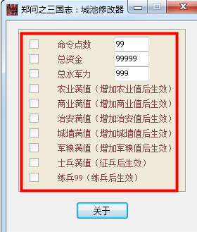 郑问之三国志城池修改器就是大家一直都在玩的《郑问之三国志》游戏的修改软件。这款最大特点就是帮助大家把游戏中的农业变成满值、商业变成满值等等,而且操作起来更加的方便,想要就赶紧来此下载吧!