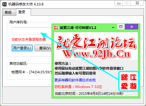 1、打开机器码修改大师和破解补丁,将图示按钮拖动到机器码修改大师的窗口中