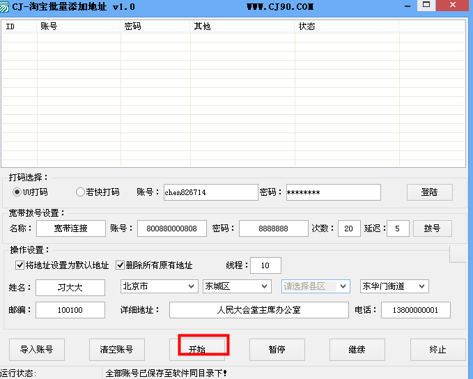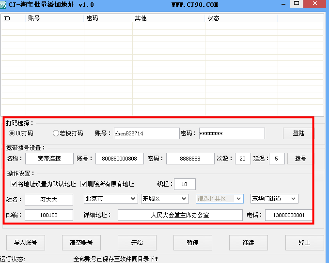 CJ淘宝批量添加地址软件其实就是款最新的淘宝绿色辅助软件。不但界面十分的美观,而且操作也相当简单,就是让淘宝卖家获得一键添加收货地址的功能,从而轻松节省大量的时间,想要的都可以进行下载!