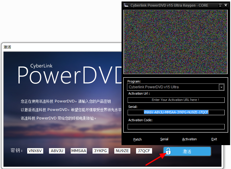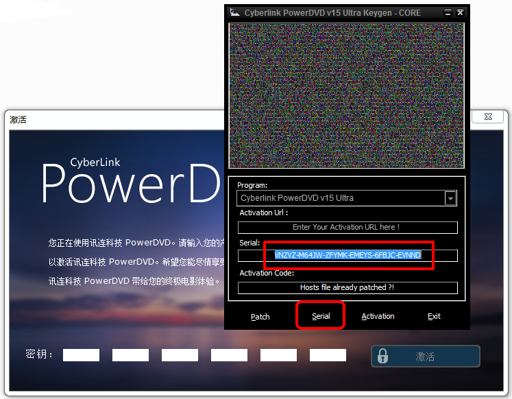 3、运行破解补丁,点击“Serial”即可获取PowerDVD 15激活码