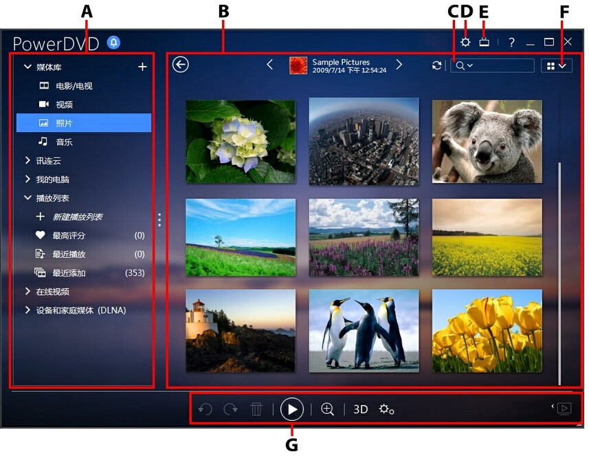 A - 媒体面板,B - 媒体窗口,C - 搜索媒体,D - 配置 PowerDVD 设置,E - 切换至剧院模式,F - 媒体窗口视图,G - 播放控制按钮