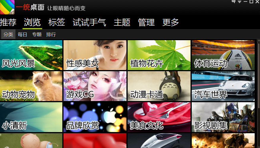 一统桌面其实就是款最新的电脑桌面壁纸软件。它里面不但包括了大家最喜欢的风景、美女、卡通、游戏等壁纸外,还能够让你根据自己的习惯来一键更换壁纸,更重要是就是它还具备护眼功能,从而更好的保护自己的眼睛!