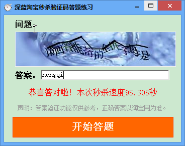 深蓝淘宝秒杀验证码答题练习是款最新的淘宝秒杀辅助工具。最大的特点就是有效模拟出秒杀题目的答题时间,而且还具备记录功能,让你能够根据他来快速适应秒杀软件。想要的都赶紧来此下载吧!