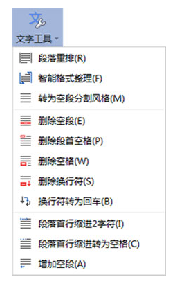 WPS 提供了批量处理文档内容段落的工具,可以对文档 进行“段落重排”、“删除空行”、“智能格式整理” 等操作,快捷简易地对文字格式重新整理。