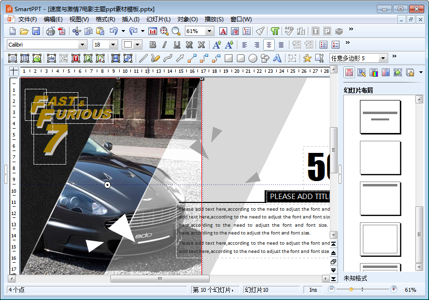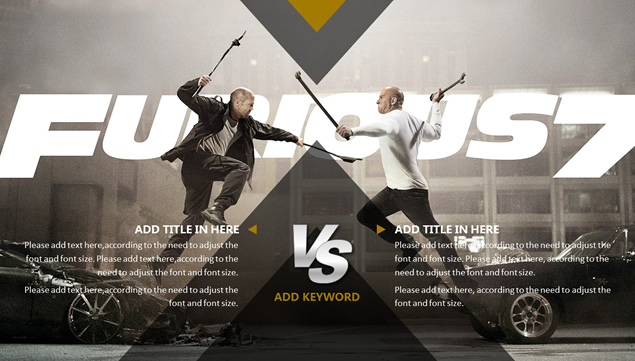 速度与激情7看了吧?怎么样?过瘾吧?什么?意犹未尽?没关系!七结束了八还会远吗?对了!更现实一点的是本节内容小编就为大家整理带来了一份速度与激情7电影主题ppt素材模板,怎么样?电影看完了这里还有PPT《速度与激情7》电影主题ppt模板可以用来回味一下的感觉简直不要太好是吧?当然,小编觉得,要是在这段时间将这份电影主题ppt模板派上用场,简直就是太Fashion了好吗?有需要的朋友快来下载吧!