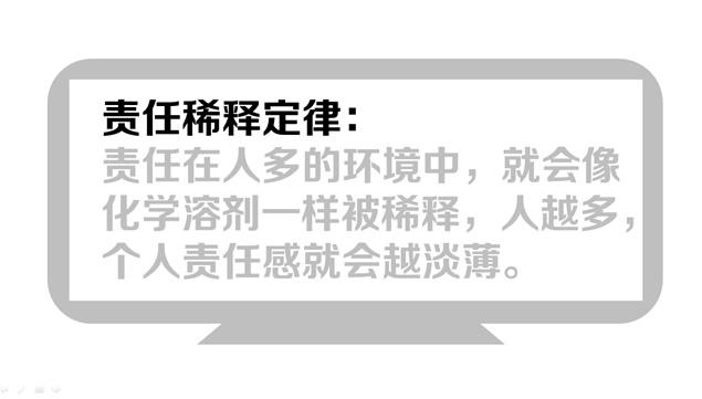 责任在人多的环境中,就会像化学溶剂一样被稀释,人越多,个人责任感就会越淡薄。
