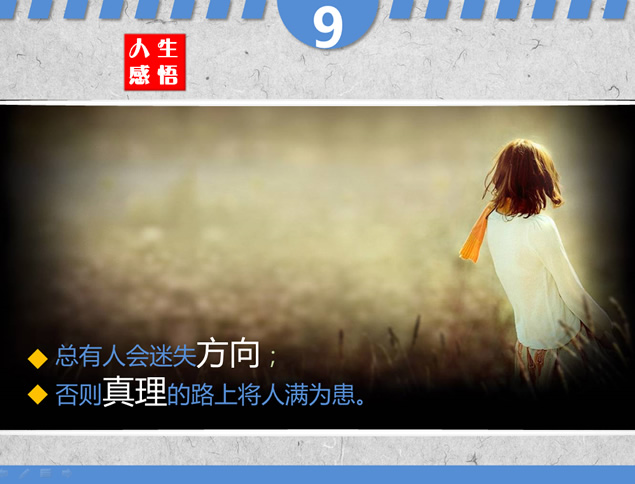 每次想抱怨工作苦工作累的时候,小编就会抬头看看天——啊!不,是墙!然后……然后就又满血复活,激情澎湃地投入到工作中——因为墙上有“严格就是大爱”几个大字啊!——好了,小编的“心灵鸡汤”正式打住,下面正儿八经为大家推荐带来一份心灵鸡汤——人生感悟励志ppt模板,如果你需要这样一份励志ppt背景,或是需要一份感悟人生的ppt,那就赶紧来下载吧!