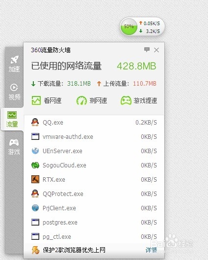 在最新版的360安全卫士有个桌面加速球,可以选择这个,然后选择流量