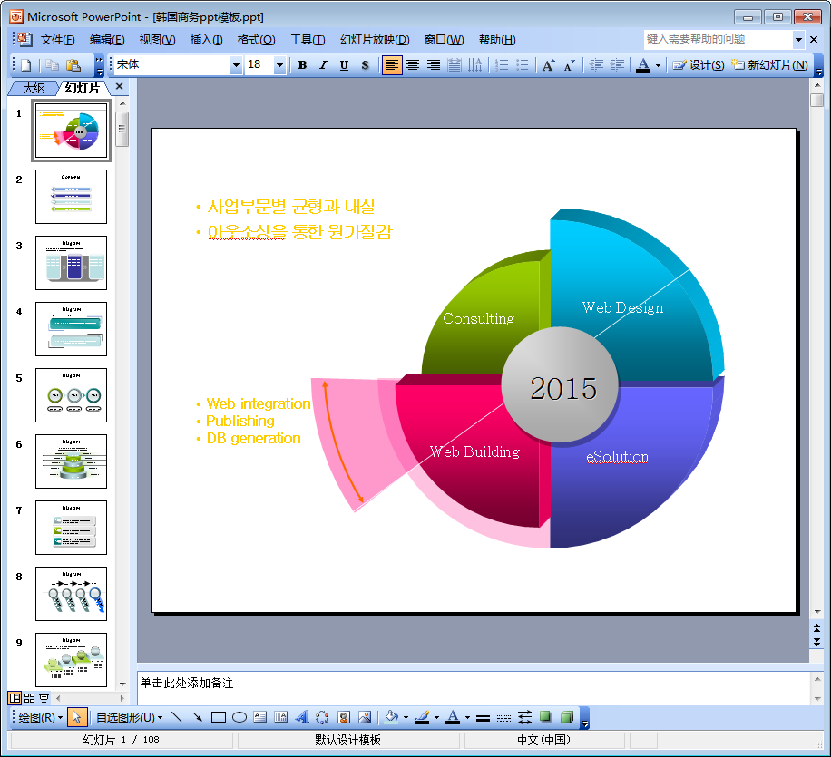 想知道韩国思密达们的商务ppt模板长什么样吗?如果你的回答是肯定的,那就赶紧来看看这份小编为你整理带来的2015最新设计还免费的、并且配色也超美的ppt模板吧!该韩国商务ppt模板共有108页,页页精美,页页都是良心制作啊!如果你需要一份韩国商务ppt模板或是韩国ppt素材,那就赶紧来下载使用这份ppt模板吧!
