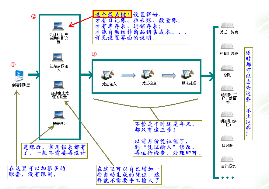 不需要像别的软件“反结账、反记账、反审核”的繁琐过程。年终也不需要额外的“年终结转”,和平时完全一样。