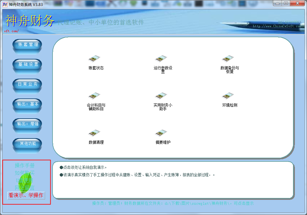 4、系统自带演示功能(软件主界面左下侧“看演示、学操作”),完全模拟真人手工建账、输入凭证、结账、产生报表的全过程