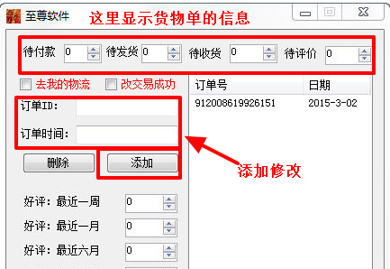 至尊淘宝后台修改软件实现一个号无限刷单的效果。可隐藏已购买的订单,修改订单日期,修改待收货参数,修改待评价,修改待付款等等修改。评价管理的参数修改