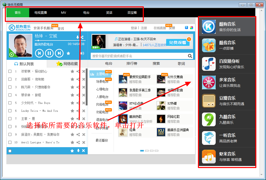 支持频道:音乐频道:百度、一听、酷我、虾米、九酷、酷狗、多米等