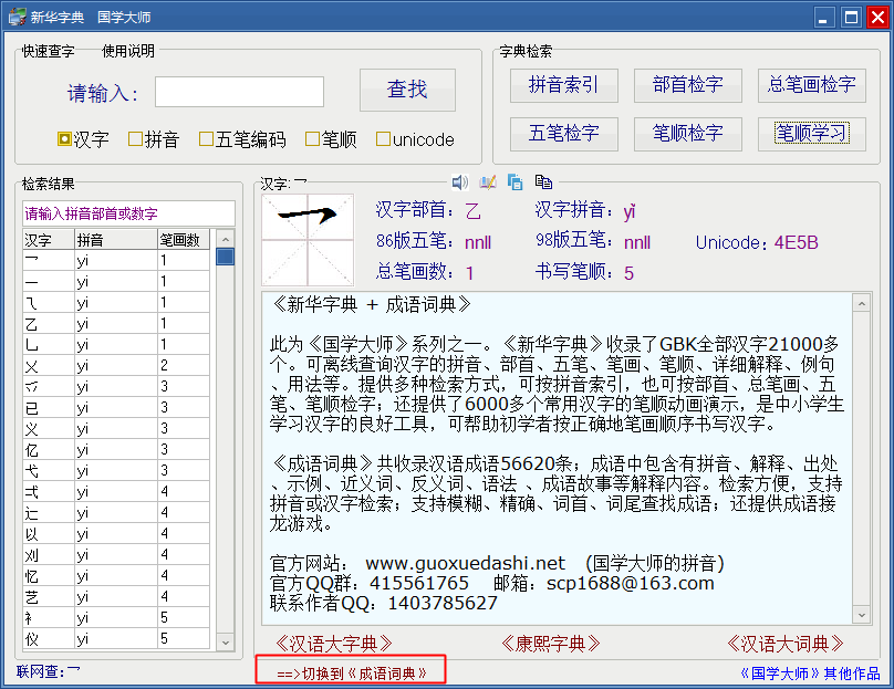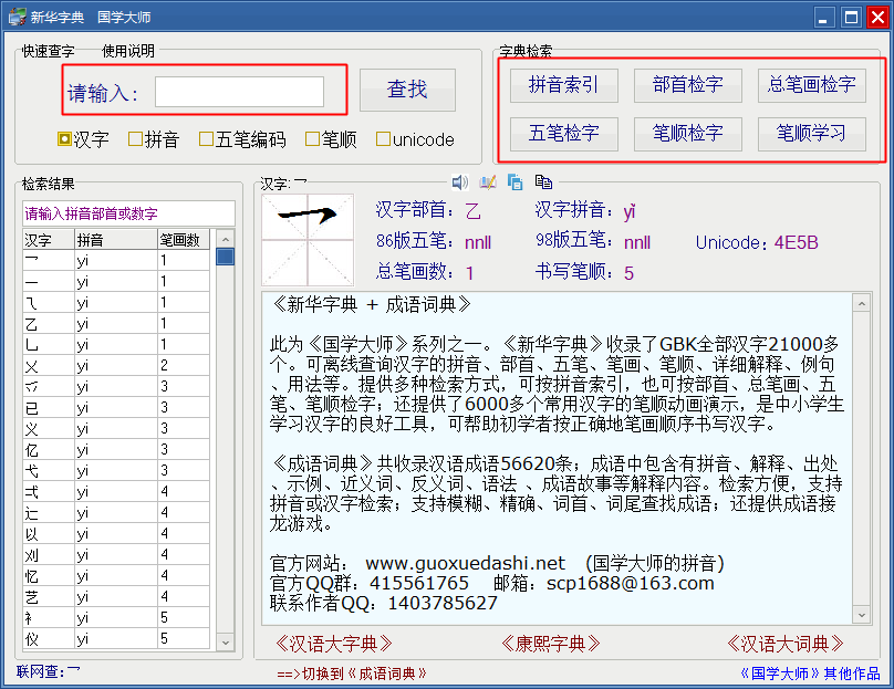 《新华字典》+《成语词典》是《国学大师》系列。《新华字典》收录了GBK全部汉字21000多个,可以查询汉字的拼音部首,解释,例句,用法,还有详细的笔画笔顺学习,《成语词典》共收录汉语成语56620条,成语中包含有拼音、解释、出处、示例、近义词、反义词、语法 、成语故事等解释内容。