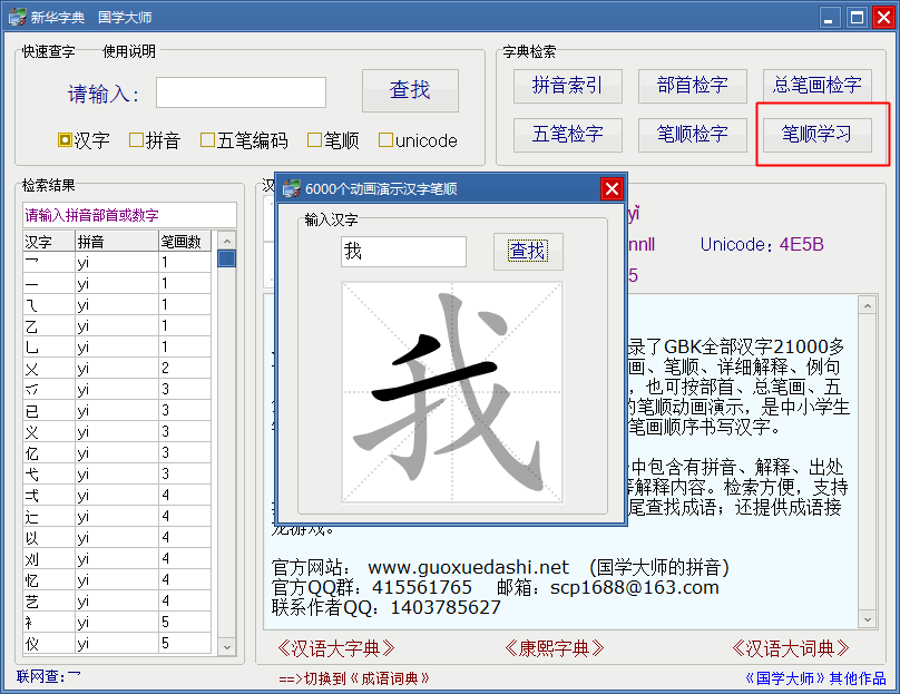 2、提供多种检索方式,可按拼音索引,也可按部首、总笔画、五笔、笔顺检字,还提供了6000多个常用汉字的笔顺动画演示,是中小学生学习汉字的良好工具。