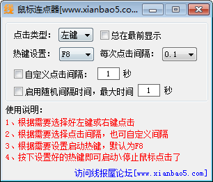 线报屋鼠标连点器绿色版是一款由线报屋出品的鼠标连点器,软件支持自动模拟人工鼠标点击操作,特别适合玩网游的朋友,而且支持自定义时间间隔,操作简单,欢迎下载使用!