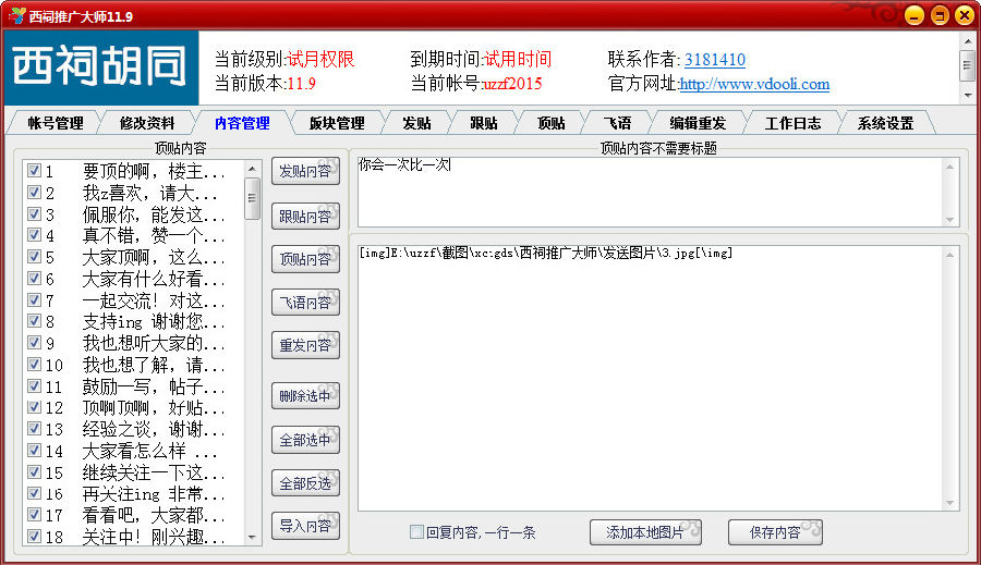 3.论坛发贴,跟贴,顶贴,发留言飞语,贴子重发等功能,多帐号多内容自动轮流发送,可发送本地图片.