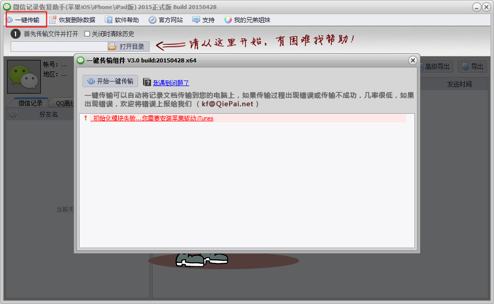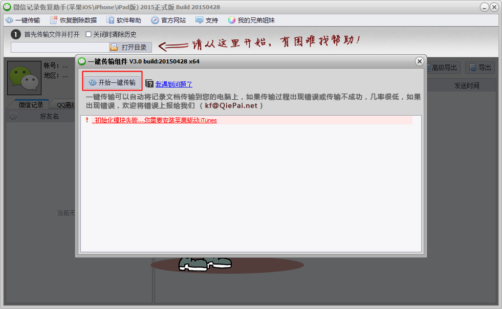 2、在新窗口中点击【开始一键传输】,然后软件会在适当的时候提醒你为当前传输的记录文件起个名字,建议起个有意义的名字,方便日后查看,例如:“3月4日传输的微信记录”。