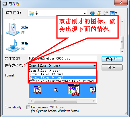 2、双击图标,出现保存界面,支持PNG格式的保存类型(默认会保存所有规格图标,需要在此窗口重新选择一次)