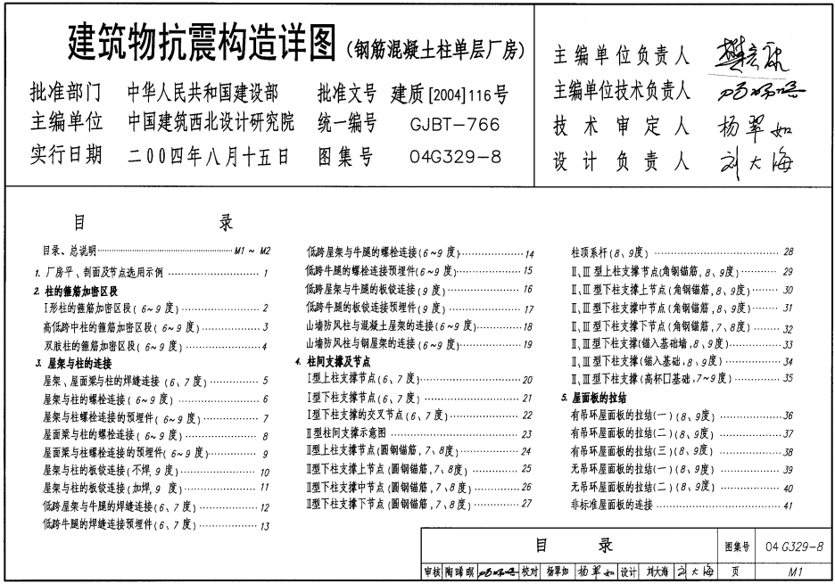 二、主要内容:在《建筑物抗震构造详图》03G329-1中,现浇混凝土结构构造包括民用建筑框架结构、框架-剪力墙结构、部分框支剪力墙结构、框架-核心筒结构、筒中筒结构,以及板柱-剪力墙结构,该分册还包括抗震设防烈度6~8度地区的装配整体式混凝土框架及框架-剪力墙结构的结构构造;在《建筑物抗震构造详图》04G329-2~8中,包括了单层砌体房屋、砖墙楼房、小砌块墙楼房、配筋砖砌体楼房、局部框架房屋、砖排架房屋以及钢筋混凝土柱单层厂房的抗震结构构造。