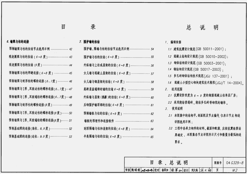 一、适用范围:《建筑物抗震构造详图》G329-1~8适用于抗震设防烈度6~9度地区的现浇混凝土结构与装配整体式混凝土结构、单层砌体房屋、砖墙楼房、小砌块墙楼房、配筋砖砌体楼房、局部框架房屋、砖排架房屋以及钢筋混凝土柱单层厂房等。