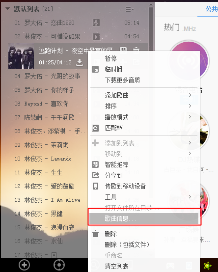1、提取酷狗音乐播放器链接地址,右键点击要提取歌曲,点击歌曲信息。