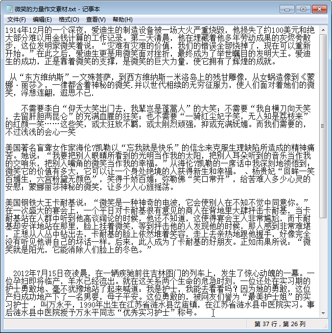 本节内容小编为大家精选带来的是一份txt格式免费版的初中生议论文作文素材——微笑的力量作文素材。如何将微笑的力量这篇议论文写好呢?论点、论据 、论证要从哪里寻找呢?如果你想找到问题的答案,不妨来看看这份微笑的力量议论文素材吧!也许它会让你找到灵感的!