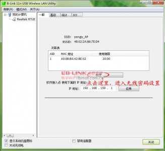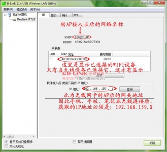 此为8188CU芯片无线网卡转AP后的界面,界面中一定要有IP地址出现,而且IP地址一定是“192.168.159.1”,如果没有这个显示,可能是软件安装有误,或是模式切换未完。