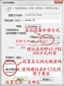 网络验证选择“WPA2-PSK”项,日期加密选择“AES”,这是为了有更高的安全等级和更好的兼容性。无线密码建议在8-15位之间,字母数字均可