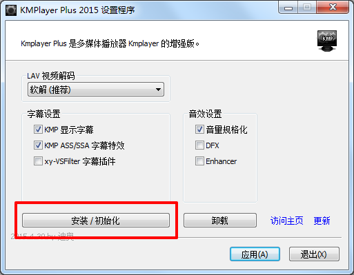 答:Kmplayer Plus 2015绿色版解压缩后需要运行 KMPSet.exe (Kmplayer Plus 设置程序) 点击 [安装 / 初始化] ,加载优化设置。如不加载,效果不好,且 DFX 之类也无法使用。