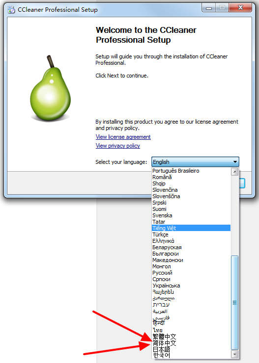 1、下载安装CCleaner Professional Plus,语言选择下拉到最下方,然后选择“简体中文”