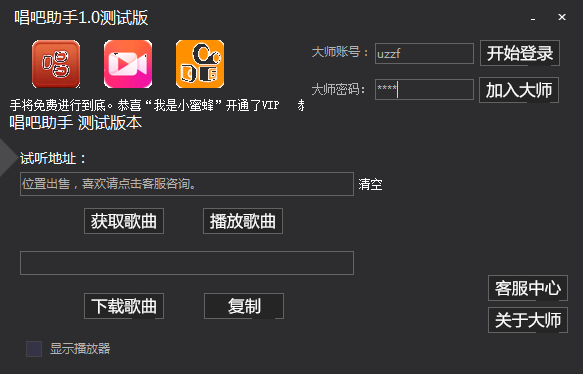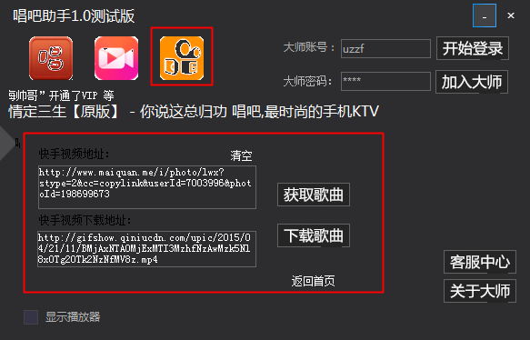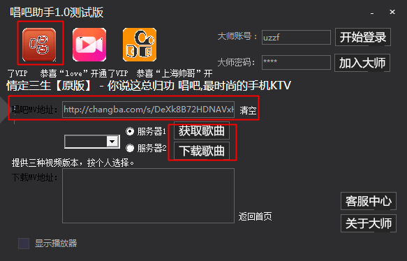 2、点击唱吧的图标,把要导出的唱吧mv链接地址粘贴进去,点击获取歌曲,获取后点击下载歌曲。