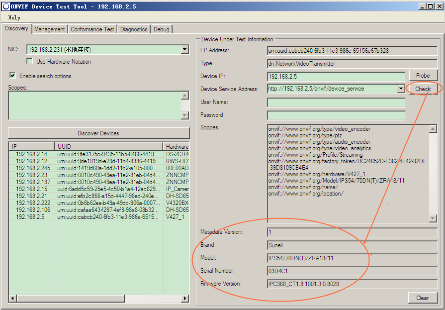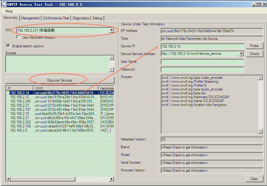 打开该软件,选择本机的IP为192.168.2.231(自动显示),点击Discover Devices按钮后,将支持Onvif协议的同一个局域网内的前端设备搜索的地址搜索出来,显示在下方,右上方为h获取的每个设备的uuid,ip等信息。