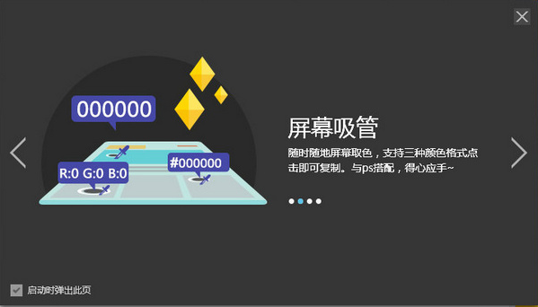随时随地屏幕取色,支持三种颜色格式点击即可复制。与ps搭配,得心应手~
