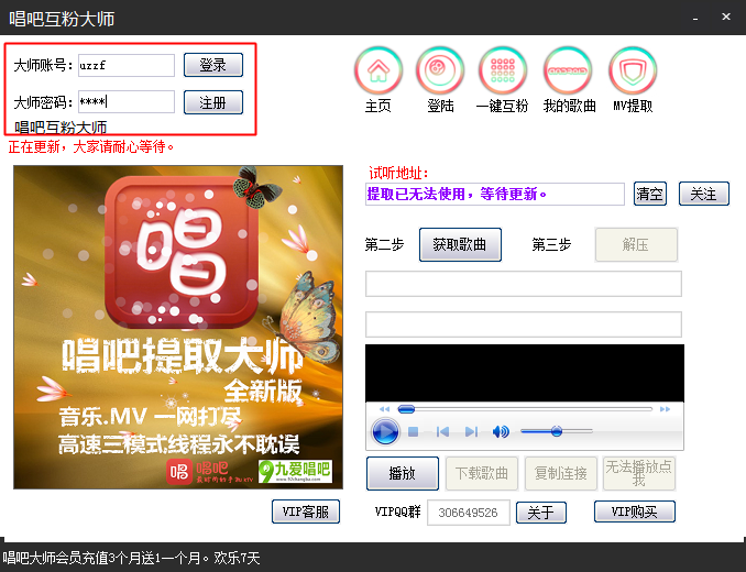 是否觉得唱吧里面的粉丝太少了呢?怎么能多增长一些粉丝呢?唱吧互粉大师是一款唱吧互粉软件,帮助你增加粉丝,支持唱吧歌曲的提取,还可以提取mv视频,方便好用。