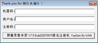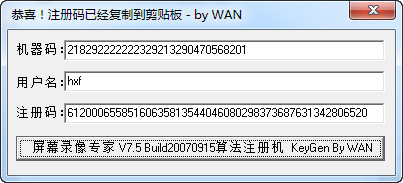 5、把机器码和用户名复制到相应位置,点击最下面的“屏幕录像专家V7.5Build20070915算法注册机”会生成注册码。