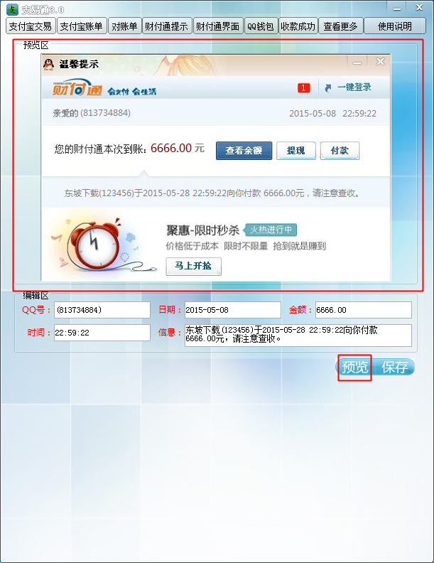 财付通截图生成器(交易通)是一款绿色破解的伪造财付通转账的软件,软件功能强大,支持支付宝、财付通、qq钱包转账图片生成,所有内容都可以自己填写,输入完成后,先预览然后确定就可以了再保存,是朋友圈装x神器。