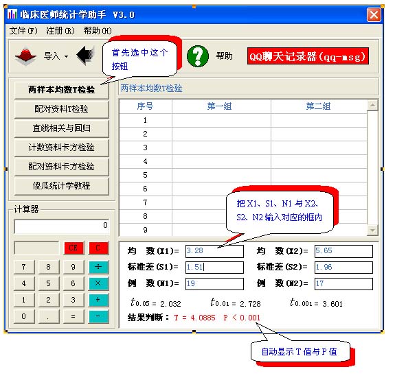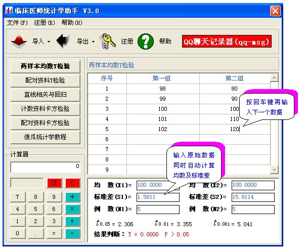 1、在输入原始数据的同时,立即显示t值及p值的计算结果,对需要进行作原始数据进一步处理时,则特别适用。