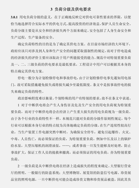 3.0.1 用电负荷分级的意义,在于正确地反映它对供电可靠性要求的界限,以便恰当地选择符合实际水平的供电方式, 提高投资的经济效益, 保护人员生命安全。